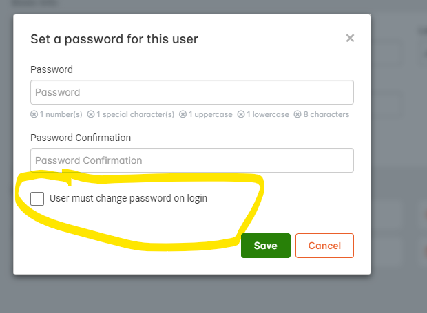 - Make sure to leave the user must change password on login box unchecked.